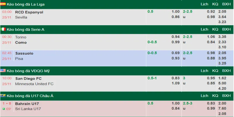 Tại trang chủ, người dùng có thể tìm lịch bóng đá theo từng giải đấu, mỗi giải có khu vực riêng hiển thị ngày, giờ, địa điểm và đội đối đầu. Chỉ cần chọn biểu tượng giải Premier League, Serie A, Bundesliga hoặc Champions League, bạn sẽ thấy toàn bộ lịch trình tuần hiện tại cùng các trận sắp tới.